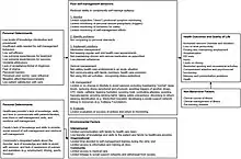 Logic models are used by planners, funders, managers and evaluators of programs and interventions to plan, communicate, implement and evaluate them.[3][2] They are being employed as well by health scientific community to organize and conduct literature reviews such as systematic reviews.[4][5] Domains of application are various, e.g. waste management,[6] poultry inspection,[7] business education,[8] heart disease and stroke prevention.[9] Since they are used in various contexts and for different purposes, their typical components and levels of complexity varies in literature (compare for example the W.K. Kellogg Foundation[10] presentation of logic model, mainly aimed for evaluation, and the numerous types of logic models in the intervention mapping framework[11]). In addition, depending on the purpose of the logic model, elements depicted and the relationships between them is more or less detailed.