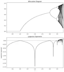 At r = 2, the function intersects precisely at the maximum point, so convergence to the equilibrium point is on the order of . Consequently, the equilibrium point is called "superstable". Its Lyapunov exponent is . A similar argument shows that there is a superstable value within each interval where the dynamical system has a stable cycle. This can be seen in the Lyapunov exponent plot as sharp dips.[13]