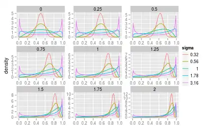 In probability theory, a logit-normal distribution is a probability distribution of a random variable whose logit has a normal distribution. If Y is a random variable with a normal distribution, and t is the standard logistic function, then X = t(Y) has a logit-normal distribution; likewise, if X is logit-normally distributed, then Y = logit(X)= log (X/(1-X)) is normally distributed. It is also known as the logistic normal distribution,[1] which often refers to a multinomial logit version (e.g.[2][3][4][5]).
