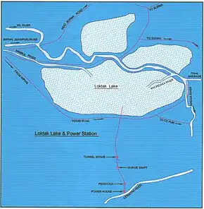 The Loktak Hydropower Project on the Manipur River or Imphal River, with the Loktak Lake forming the head waters to provide regulated storage for power generation, was built in 1983 as a multipurpose project with power generation of 105 MW (3x35 MW) for power supply to Manipur, Nagaland, Assam, Mizoram, Arunachal Pradesh, Meghalaya and Tripura, and lift irrigation to an area of 23,000 ha (57,000 acres) in the Manipur valley. The main components of the project, as built, are, a) the Ithai Barrage, across the Manipur river of 10.7 m (35.1 ft) height and 58.8 m (192.9 ft) length with three spillway bays, b) water conductor system for trans-basin diversion comprising an open channel of 2.323 km (1.443 mi) length, a cut and cover section of 1.077 km (0.669 mi) length (bed width 18 m (59 ft), followed by a Head Race Tunnel of 3.81 m (12.5 ft) diameter (horseshoe type) and 6.62 km (4.11 mi) long to carry a discharge of 58.8 m3/s (2,080 cu ft/s) (42 m3/s (1,500 cu ft/s)) for power generation and 16.8 m3/s (590 cu ft/s) for irrigation), c) a surge shaft, d) penstocks and e) a surface powerhouse and a tailrace channel on the right bank of the narrow Leimatak River with three units of 35 MW capacity each generating an annual energy of 448 GW·h (1.613 PJ).[18] The downstream Loktak Power Project in cascade to utilize the regulated releases from the upper project for further power generation of 90 MW is proposed to be taken up for joint implementation by NHPC and the Government of Manipur.[19] The project has invited severe criticism since the water level in the lake at the Ithai barrage is maintained throughout the year at FRL 786.5 m (2,580 ft) from considerations of power generation from the well planned water conductor system. The problem in the lake is, however, diverse; economic activities in and around the lake, and encroachments by 50,400 fishermen for extensive fishing activity are also cited to be some reasons. Other reasons for the distress situation in the lake are a) jhum (shifting) cultivation, b) extensive deforestation and unscientific land use practices in the catchment areas which bring large amount of silt into the lake and c) undefined ownership of the lake where the stakeholders are the districts of Imphal west district, Bishnupur and Thoubal causing lack of integrated approach to the lakes potential for providing benefits.[13]