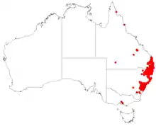 Lomatia silaifolia is found across much of eastern Australia east of the Great Dividing Range, on the Blackdown Tableland in central Queensland, then from Gympie in the south-east of the state to the New England area of north-eastern New South Wales, and then also from the Hunter Region to Jervis Bay in central New South Wales.[1] It grows as an understory shrub in open forest on sandstone soils, associated with such trees as red bloodwood (Corymbia gummifera), turpentine (Syncarpia glomulifera), blackbutt (Eucalyptus pilularis), Sydney peppermint (E. piperita), narrow-leaved peppermint (E. radiata), blue-leaved stringybark (E. agglomerata), red stringybark (E. macrorhyncha), grey gum (E. punctata), scribbly gum (E. sclerophylla), smooth-barked apple (Angophora costata) or rose sheoak (Allocasuarina torulosa).[10]