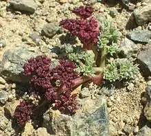 Plants are small, usually less than 20 cm (8 inches) tall. Foliage has a blue-gray to green color, and is held on thick fleshy stalks. Leaves are fleshy and are dissected into leaflets that have a sharp extended tip, referred to by the species name cuspidatum.[3] Flowers appear early in the growth season (May to June) and are held above the foliage in a compound umbel on thick fleshy stalks that arise from the base of the plant. The flowers are brownish purple to brownish red in color.[3]