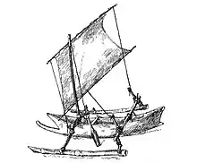 They are about 5 m in length,[2] generally they are driven by paddle but sail may also used.[3][4] Modern londe can be equipped with an outboard motor.[4] The sail can be of tanja, lete, or lug sail type.[5] Sometimes they are 25–30 ft (7.6-9.1 m) long with 30 in (76.2 cm) beam.[6] They are usually operated by 1-3 men,[2][4] but large ones could carry 5 men.[7] A londe can be identified by its unique bow and stern. A kind of "horn" pokes out from the bottom of the bow protruding forward and curling upwards like an elephant tusk. At the stern the horn is not so prominent but the form can be seen, protruding backward.[8] Its supposed predecessor, bininta, had its bow and stern a horn that pokes toward the front and back.[2] Another distinguishing feature from other outrigger canoe, the londe has different bahateng (outrigger boom/beam) on the front and the back.[8] The fore boom is a strongly curved piece of wood lashed to the atiq (outrigger float made of bamboo) without a tadiq (the linking piece between bahateng and atiq).[8][3] The atiq is made by two or three pieces of thick bamboo lashed together.[3] While the aft boom is a straight piece of wood linked to the atiq with a curved rattan tadiq, the so-called S-shaped Halmaheran attachment.[8][3] Londe is constructed with added planks on the side of its mahera (dugout base).[8] The main material is nantu/nato wood, gopasa wood, or kapuraca wood.[9] With a fair wind, londe can go very fast but somewhat difficult to tack and cannot sail very close to the wind.[6]