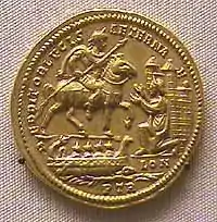 In 296, Chlorus mounted an invasion of Britain that prompted Allectus's Frankish mercenaries to sack Londinium. They were only stopped by the arrival of a flotilla of Roman warships on the Thames, which slaughtered the survivors.[95] The event was commemorated by the golden Arras Medallion, Chlorus on one side and on the other a woman kneeling at the city wall welcoming a mounted Roman soldier.[96] Another memorial to the return of Londinium to Roman control was the construction of a new set of forum baths around 300. The structures were modest enough that they were previously identified as parts of the forum and market but are now recognised as elaborate and luxurious baths including a frigidarium with two southern pools and an eastern swimming pool.