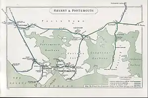 In 1853 the Direct Portsmouth Railway gained parliamentary authority to build a line from Godalming to Havant with the intention of the company selling itself either to the L&SWR or the LB&SCR. This scheme would provide a far more direct route to Portsmouth but involved sharing the LB&SCR tracks for the five miles (8 km) between Havant and the joint line to Portsea.[9] The LB&SCR objected to the scheme but the L&SWR negotiated with the new company and in December 1858 sought to operate a train over the new route. The LB&SCR attempted to prevent the use of its tracks and the so-called 'battle of Havant' ensued. The matter was eventually resolved in the courts in August 1859, and relations between the railways were formalized in agreements of 1860 and 1862.[10]
