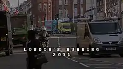 London's Burning (credited on-screen as London's Burning 2011) is a single British television docudrama film, written by Mark Hayhurst and directed by Justin Hardy, that premiered on Channel 4 on 22 December 2011.[1] Based upon the events of the 2011 England riots, written from "first-hand testimony" and incorporating real-life footage from CCTV cameras, journalists & members of the public, the film stars David Morrissey and Samantha Bond as the senior police officers assigned to oversee deployment of police resources across the capital as the riots begin to escalate following the events of 4 August, which saw the Death of Mark Duggan at the hands of the Metropolitan Police.[1]