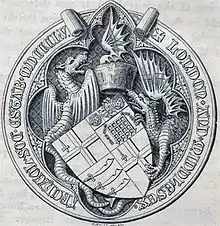 Ody's design was a reworking of the Society's original device, introduced at its foundation, and engraved by Orlando Jewitt (one of the original members). This showed the same combined arms, presented as if on a medieval seal, and surrounded by the legend +LONDON⋅AND⋅MIDDLESEX⋅ARCHÆOL⋅SOC⋅ESTAB⋅MDCCCLV. The only heraldic variation is that in Jewitt's design the supporters appear as wyverns (i.e. with only two legs), rather than four-legged dragons. By the mid-20th century, Jewitt's design was considered "perhaps a little crowded", and Ody was asked to redraw it to "represent the taste of 1955".[21]
