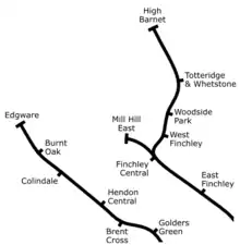 In the north of the borough on the eastern side is Barnet, also known as High Barnet or Chipping Barnet, Totteridge, and Whetstone. In the north on the western side is Edgware and Mill Hill. The central northern part of the borough is largely countryside. This division is largely because the eastern side grew around what is now the High Barnet Underground branch of the Northern line. The western side grew around the Midland Railway and what is now the Edgware branch of the Northern line.