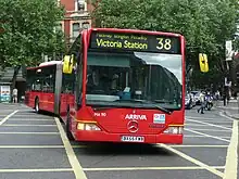 On 29 Oct 2005, route 38 was converted to one man operation with the AEC Routemasters replaced by 46 Mercedes-Benz O530G articulated buses.[3][4] Double deck buses were introduced on 14 November 2009 as part of the Mayor of London's policy to withdraw articulated buses from London. The frequency of the route was increased to every 2–3 minutes.[5]