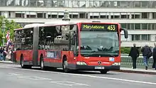 Route 453 commenced operating on 15 March 2003 as part of a reorganisation of routes in preparation for the introduction of the London congestion charge. Operating between Deptford Bridge and Marylebone stations,[1] it parallels route 53 as far as Lambeth North station. It was initially operated by Stagecoach London's Plumstead garage with Mercedes-Benz O530G articulated buses. Night route N453 was introduced at the same time.[2]