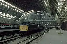 On 7 October 1957, the signalling at St Pancras was upgraded, replacing the three original boxes with a power box controlling 205 route switches and 33 points over a network of 1,400 relays.[40] From 1960 to 1966, electrification work on the West Coast Main Line between London and Manchester saw a new Midland Pullman from Manchester to St Pancras.[41] These trains and those to Glasgow were withdrawn following the completion of the rebuilding of Euston and the consolidation of these services.[38]