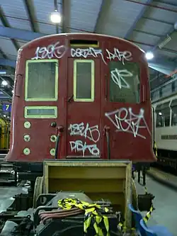 ![]() The graffiti covered front end of a Q38 Stock driving motor car at London Transport Museum Depot | |