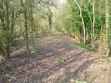 South of junction 6 of the M25 motorway the Roman road has remained in use as the B2235 through Godstone and then as Tilburstow Hill road, in a series of straight alignments adapted to the terrain. Roman burial urns were found beside the road at Tilburstow Hill Common. Between Tilburstow Hill and Blindley Heath Margary noted large hedgebanks set back on either side of the modern lane, indicating the overall width of the road, adapted as a medieval droveway. North of Blindley Heath the A22 road rejoins the Roman line through the village before the Roman road turns south east through Shawland's Wood, then across open fields to cross the B2028 road, south of which it is seen as a hedgeline and is a parish boundary.[14] This modified alignment then crosses the Eden Brook and turns south-west onto the modified north section of a long and largely straight alignment to Clayton. This eastward shift of the alignment avoided wet low-lying ground.[1]