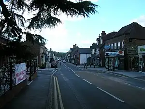 On Blythe Hill the road turns 9 degrees to the south, and crosses the River Pool, then turns another 6 degrees southward onto the next main alignment. Here the intact road was found to be made of gravel on pebbles and flints under a golf course. It then crosses the railway about 210 metres (230 yd) east of Beckenham railway station. Going through Beckenham it passes close to Langley House then east of West Wickham village centre, crosses Corkscrew Hill, and goes down to the Addington to Hayes road, where there was once a small settlement. From Rowdown Woods the Surrey/Kent county boundary follows the road, making a V shaped kink at Skid Hill where the road deviates from the alignment to cross a steep valley.[3] This alignment, marked by tracks and hedgerows, continues to the top of the North Downs above Titsey where it is more than 260 metres (850 ft) above sea level. Here the road makes a sharp turn eastwards to follow the ridge of the downs, passing south of Tatsfield church before beginning its descent of the escarpment on a terraceway, originally 3.8 metres (12 ft) wide, passing west of the rectory, to cross the Pilgrims Way. The road is followed by the Titsey-Tatfield parish boundary for 4 kilometres (2.5 mi).