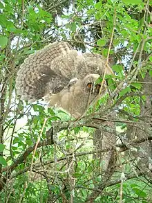 The young hatch at 2 day intervals at any point between very late April and June.[4][174] The average weight of 52 hatchlings in Montana was 18.4 g (0.65 oz).[265] Their eyes open at 5–7 days (averaging 6.4 days in Montana) and they are brooded by the mother for about 2 weeks, often while the male perches nearby and watches over. The female alone feeds the chicks. In Idaho, the male was recorded to 2.5 times more prey deliveries during nesting than did the female.[8][99][265] Injury feigning displays have been recorded at the nestling stage as an anti-predation measure.[8][9][64] Usually long-eared owls are less bold in nest defense than some other owls, Strix owls for example, but they are capable of fierce protective attack nonetheless. Nesting defense by parents increased in Italy further into breeding season, with older nestlings being defended more vigorously. Females do a majority of nest defenses. Owl pairs incurring higher levels of regular disturbance are more likely to have a milder nest defense.[4][99] During a defensive display, the parent ruffles up their plumage and partially spreads the wings to half open, trampling from one foot to the other, hissing and bill snapping and can look surprisingly large in this posture. If a perceived threat continues towards the owls, they may leap up and try to rake and grab at the threat with their talons. Even animals as large as humans may find themselves the victim of long-eared owl defensive attacks if they approach or, especially, if they climb up to a nest.[9][36] The young leave the nest at 20–27 days of age (average about 22 days) but are initially flightless, often climbing about surrounding branches. At this stage they may be referred to as "branchers".[8][264][265] Quite often the young fall to the ground, but they are usually able to climb back up using their claws and bill with heavy wing flapping. At dusk the begging branchers call to their parents with high pitched notes to indicate their location. At about 35–37 days, they are fully fledged and can fly well, but they often follow their parents and are fed by them for up to about 2 months, continuing to make high pitched calls.[8][9][265] In Slovenia, independence was gained about 50–80 days after hatching, while in Idaho it was about 45 to 56 days.[99][268]