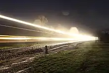 Freight train passing through Gore, New Zealand. The 'BULB' mode on a DSLR camera was used for this photo. Note the "flashing" of the locomotive ditch lights.