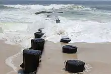 Some of the island's 18 miles (29 km) of beaches have experienced significant erosion in recent decades, threatening the multimillion-dollar waterfront homes in the area.[14] In 2005, with the help of the Army Corps of Engineers, work began on a $75 million project to build a 22-foot (6.7 m) high, 30-foot (9.1 m) wide dune the length of the island using sand pumped from offshore. In front of the dunes, a 200-foot (61 m) wide stretch of sand separates the dune from the ocean.[14] The beach replenishment project began in Ship Bottom and Surf City. With work on those beaches now complete, the project continues toward the northern end of the island. Beach replenishment has been a hugely controversial topic. Many surfers and swimmers argue that pumping the sand destroys the sandbars that create waves and provide a better swimming environment. Some homeowners claim dunes will reduce property value, while island officials argue dunes are necessary to counter beach erosion and protect the island from storms.