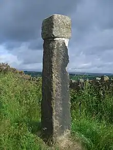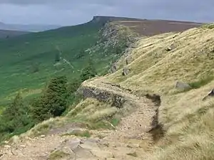 Between Redmires Reservoir and Dennis Knoll car park, just north of Hathersage (a distance of approximately four km), Long Causeway still exists as an unsurfaced track. This track is a BOAT (Byway Open To All Traffic), however recently this has been subject to a Traffic Regulation Order from the Peak District National Park, and vehicles have been banned. Small areas of the track are still paved in parts with the most extensive section being an 80-metre stretch just to the west of Stanage Pole.[1] In early 2013 Derbyshire County Council carried out some resurfacing work between Stanage Edge and Dennis Knoll car park; this resulted in many of the large boulders being removed, leaving a smooth surface for horse riders and walkers. Many people have said this is out of character with the ancient track and a National Park.[8]