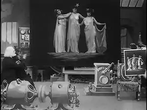 Williams described sexist and voyeuristic overtones in the scene in which an image of the Three Graces is projected, "reproducing an image of women's bodies to the voyeuristic measure of male desire."[5] The film scholar Elizabeth Ezra went further, commenting that the machine does not in fact attempt to show actual women at all, but rather only an image from a male imagination: "These constructed women are also machines in themselves, which do exactly what they are programmed to do, and whose behavior differs noticeably from that of real women."[9]