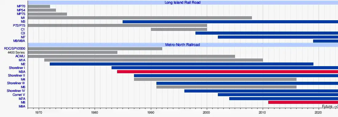 One of the most popular decisions by Governor Nelson A. Rockefeller after the 1966 takeover was replacing the entire electric passenger fleet with M1 cars.[4] It acquired 770 M1 cars built by Budd and General Electric from 1968 to 1974, and 174 M3 cars, built in 1985 and 1986, also by the Budd Company.[5][6]