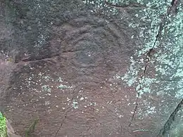 The Long Meg monolith has motifs on the face looking towards the circle arranged in three sections. The markings include: in the centre, a cup at the centre of three rings, a spiral of four turns and various concentric arcs; in the lower section, three faint figures at the left-hand corner, an anti-clockwise spiral, cup and ring and various concentric arcs; in the upper section are faint rings, ovoids, spirals and other markings. Some of the stones in the circle itself have artificial markings on them as well.[16]