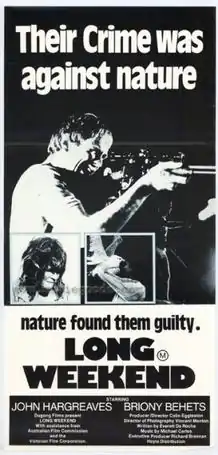 Long Weekend is an Australian psychological thriller film shot in 1977 and first shown in 1978. The film was directed by Colin Eggleston and stars John Hargreaves and Briony Behets.