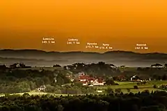 - Planetary ephemeris – very rarely might happen a situation, where i.e. Jupiter[11] or Venus will rise or set above some prominent distant object or construction. This type of observation is extremely difficult because of the large zoom with long exposure combination