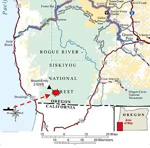 Although Razz did not see the bombing, he saw the smoke plume and reported the fire to the dispatch office. He was instructed to hike to the fire to see what suppression he could do. Dispatch also sent USFS Fire Lookout Keith V. Johnson from the nearby Bear Wallow Lookout Tower. Fujita dropped two bombs, one on Wheeler Ridge on Mount Emily in Oregon. The location of the other bomb is unknown. The Wheeler Ridge bomb started a small fire 16 km (9.9 mi) due east of Brookings.[6]