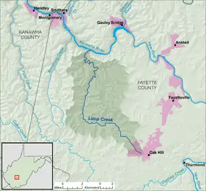 Loop Creek, also known by the spelling Loup Creek,[1] is a tributary of the Kanawha River, 20 miles (32 km) long,[3] in southern West Virginia in the United States. Via the Kanawha and Ohio rivers, it is part of the watershed of the Mississippi River, draining an area of 49.6 square miles (128 km2)[4] in a coal mining region on the unglaciated portion of the Allegheny Plateau.