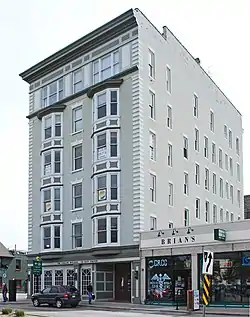 The Loraine Building is a rectangular, six-story brick Georgian Revival structure, measuring 92 feet by 45 feet, with a flat roof. The front and side facades contain prominent wooden bay windows projecting from the second to the fifth floors. There are two projecting bay units on the front facade, separated by a set of one-over-one windows, and three projecting bay units on the side facade, separated by three sets of one-over-one windows. A metal, dentiled cornice runs across the top of the building. A smaller matching dentiled belt course runs above the first floor. The facades have brick decorative elements, including angle quoins and rusticated keystones over windows. The first floor contains entrances into the commercial space. Two metal fire escapes run up the sides.[2]