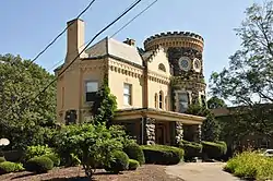 The 2+1⁄2-story masonry house was built as a private residence inspired by Norman castles. Its most prominent feature is a large three-story circular tower with extensive corbelling and crenellations, details that are repeated on the main block of the house. It reportedly took Lord ten years to complete.[3]