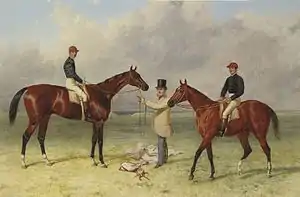 Lord Lyon was foaled in 1863 at Oakley Hall, the stud farm of General Mark Pearson which was located twenty miles outside of Oakham in Northamptonshire.[2] He was sired by Stockwell, winner of the 1852 St. Leger and 2,000 Guineas Stakes and a seven-time leading sire. Lord Lyon's dam, Paradigm, was not "fashionably bred" being sired by Paragone, a "3-guinea" sire noted more for producing hunt horses than racehorses.[3] Paradigm's dam, Ellen Horne, was purchased by Pearson for around 18 guineas for his wife to use as a hack horse.[4] Paradigm was an unsuccessful racehorse, running only twice and placing in the Lavender Stakes as a two-year-old before she fractured pastern while running in the Bentinck Memorial at Goodwood[5] forcing her retirement from racing.[6] Like her dam, Paradigm was also used as a hack before she entered the stud.[3] Paradigm was later heralded as a worthy broodmare. In 1864, she foaled Lord Lyon's full sister, Achievement, which won the 1867 St. Leger, Doncaster Stakes and Coronation Cup among many other races. Another full-sister, Chevisaunce, was the dam of the Epsom Oaks and St. Leger winning filly Jannette.[7] Paradigm produced a total of 13 foals and also produced King at Arms, Man at Arms and Blue Mantle.[6]