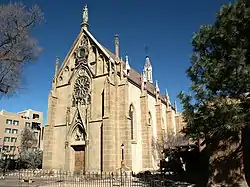The chapel was commissioned by the Sisters of Loretto for their girls' school, Loretto Academy, in 1873. Archbishop Jean-Baptiste Lamy had brought in two French architects, Antoine Mouly and his son Projectus, to work on the St. Francis Cathedral project, and suggested that the Sisters could make use of their services on the side to build a much-needed chapel for the academy.[4] Projectus ended up being the main architect for the project, basing his Gothic Revival design—complete with spires, buttresses, and stained glass windows imported from France via the Santa Fe Trail—on the famous Sainte-Chapelle in Paris. The chapel was built from locally quarried sandstone and took five years to complete, being officially consecrated in 1878.[5][6]