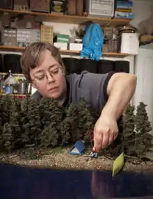 Nix considers herself a "faux landscape photographer", and her work is influenced by extreme weather and disaster films.[4] She works without digital manipulation, using miniatures and models to create surreal scenes and landscapes, building dioramas that range from 20 inches to six feet in diameter.[5] They take several months to build, and two to three weeks to photograph. For many years Nix used a large format 8 × 10 film camera[6][7] but in 2015 she started photographing her dioramas with a digital camera. Nix works with Kathleen Gerber, a trained glass artist, constructing most of the scenery by hand from scratch, using "foam and glue and paint and anything else handy."[8] After the final photograph is made, Nix harvests the diorama for pieces for future use and then destroys it.[9][10][11]