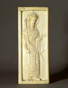 The loros was also worn at Easter by the "twelve dignitaries", holders of the ranks of magistros and anthypatos, as well as by the Eparch of Constantinople and the zoste patrikia during the ceremonies of their promotion.[9] It was said to symbolize the winding-sheet of Christ, with the officials as the Twelve Apostles.[10] It is also worn by archangels in Byzantine art,[11] which spread to medieval art in the West, as they were regarded as the high officials of God. It seems the loros-costume was not worn at the coronation of the Emperor, although he was given it in the course of the ceremony, and when crowned by Christ in art always wears it.[12]