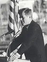 During the 1960s, LAHS began to attract attention for its consistent academic performance, low drop-out rate, and innovative teaching methods.[7][8] President John F. Kennedy noted LAHS and other local schools during his visit to Los Alamos in 1962: "I've admired from some years ago, from reading an article about the kind of schools that you run here and the kind of boys and girls that you're bringing up."[9] In 1964, after the assassination of President Kennedy, the community of Los Alamos[10] erected a permanent memorial in his honor at the high school football field.