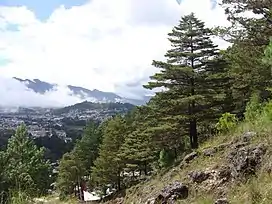 The higher elevations are covered by pine forests, with Mexican yellow pine (Pinus oocarpa) and smooth-bark Mexican pine (Pinus pseudostrobus). Pine–oak forests include Mexican yellow pine and smooth-bark Mexican pine with Quercus peduncularis and other species of oaks.[5]