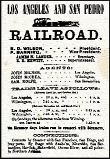 The Los Angeles & San Pedro Railroad was Southern California's first railroad. Its 21-mile (34 km) line from San Pedro Bay to Los Angeles was built from 1868 to 1869 and began operations on October 26, 1869.[1] The railroad was the brainchild of Phineas Banning[2] and its primary purpose was to transport freight from the port to the city.