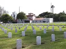 The entrance to the cemetery is located at 950 South Sepulveda Boulevard (90049) at Constitution Avenue, near the intersection of Sepulveda Boulevard and Wilshire Boulevard. It is adjacent to Westwood, Los Angeles and UCLA along the east across Veteran Avenue, and the main Sawtelle Veterans Home campus across the San Diego Freeway (405) along the west. The cemetery was dedicated on May 22, 1889.[1] It is directly connected to the central Veterans Home facilities by Constitution Avenue's underpass below freeway.