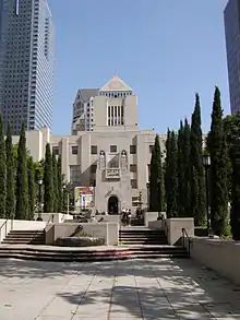 The Central Library Goodhue building was constructed in 1926 and is a Downtown Los Angeles landmark.[14] It was designed by architect Bertram Goodhue.[15] This was his last work, because the man died suddenly in 1924.[16] The Richard Riordan Central Library complex is the third largest public library in the United States in terms of book and periodical holdings. Originally named the Central Library, the building was first renamed in honor of the longtime president of the Board of Library Commissioners and President of the University of Southern California, Rufus B. von KleinSmid. The new wing of Central Library, completed in 1993, was named in honor of former mayor Tom Bradley.[17] The complex (i.e., the original Goodhue building and the Bradley wing) was subsequently renamed in 2001 for former Los Angeles Mayor Richard Riordan, as the Richard Riordan Central Library. The building was burned out by a catastrophic fire in 1986 when a million books and many other records (patents, play scripts, photographs) were damaged or totally destroyed. Arson was suspected but never proved.[18]