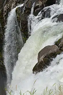 The frequent rain support numerous rivers and stream and creates lakes, especially in dormant volcano cones, with 2.8% of the region covered by surface water. Fresh water flow in the region accounts for 14.8% of the entire state of Veracruz.[4][7] The rugged terrain and water flow makes for numerous waterfalls, with the largest and best known being Eyipantla and the tallest being Cola de Caballo.[6][9] The region is part of the Papaloapan River Basin, with major rivers including the Papalopapan, San Juan Grande de Catemaco, Coxcoapan, Coetzala, Ahuacapan, Hueyapan, el Carrizal, La Palma, Olapa, Yohualtapan, Arroyo de Liza, Arroyo Rejon, Cold-Maquina, Gachapa, La Palma, Oro, Prieto, Salinas and Toro Prieto.[7] The best known lake is Lake Catemaco, which is about ten km across and contains twelve islands.[6] The other major lakes and lagoons includes the Sotecomapan Lagoon, Esmeralda Lake, Pizatal Lake and Laguna Grande.[7]