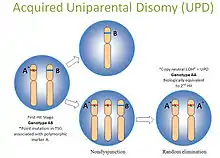 Copy-neutral LOH is thus called because no net change in the copy number occurs in the affected individual. Possible causes for copy-neutral LOH include acquired uniparental disomy (UPD) and gene conversion. In UPD, a person receives two copies of a chromosome, or part of a chromosome, from one parent and no copies from the other parent due to errors in meiosis I or meiosis II. This acquired homozygosity could lead to development of cancer if the individual inherited a non-functional allele of a tumor suppressor gene.
