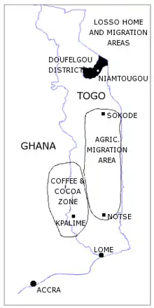The Lossos have migrated in search of fertile available land to the area along the North-South National Road No. 1 between Sokodé and Notsé, where they have founded numerous communities. In addition, they have migrated to Togo's capital city, Lomé, and to Accra, the capital of Ghana, in search of wage employment. They have also migrated to the Plateau Region of Togo and the Volta Region of Ghana precisely in the actual Oti Region where they work as sharecroppers in coffee and cocoa plantations. Losso men served in the colonial armies of Germany, Britain, and France as well as in the Ghanaian and Togolese armies in the years following the independences of the two countries.