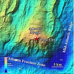 The Lost City Hydrothermal Field, often referred to simply as Lost City, is an area of marine alkaline hydrothermal vents located on the Atlantis Massif at the intersection between the Mid-Atlantic Ridge and the Atlantis Transform Fault, in the Atlantic Ocean. It is a long-lived site of active and inactive ultramafic-hosted serpentinization,[1] abiotically producing many simple molecules such as methane and hydrogen which are fundamental to microbial life. As such it has generated scientific interest as a prime location for investigating the origin of life on Earth and other planets similar to it.[2]