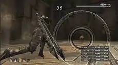 In combat, both the player's party and enemies are arranged in two lines, front or back. Up to five party members can participate in battle at once.[11] At the start of battle, the back line is protected by a special defensive "wall" which is based on the combined hit points of the front line.[12] This wall reduces damage that the characters in the back experience.[13] However, as the front line takes damage, the wall weakens, and can only be recovered through the use of certain spells or skills.[13]
