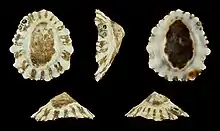 The shell size is between 19 and 40 mm and the shell is rather depressed. The apex of the shell has a small depression, a very elongated outline and is located at the anterior third of the shell. In some specimens the apex is nearly central, with a rounded shell.[3]