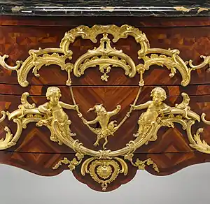 The Commode (whose name means "convenient") was invented under Louis XIV to replace the coffre, or large chest. It was heavy and boxlike, with short legs, and abundant decoration of gilded bronze. During the Regency and early style of Louis XV, particularly in the commodes of Charles Cressent, commodes became more graceful, with longer S-shaped legs and espagnolettes, or stylized female torsos, on the corners above the legs. The fronts of commodes became more rounded in form. Gilded bronze vines curled and wound across the facade. Bronze ornaments in the form of masks were replaced by faces of smiling women, palmettes, and, later in the period, a new theme, s stylized bat wing. The seashell was a common central element of the rocaille decoration, often combined with acanthus leaves. Handles of drawers were shaped like intertwined flowers. Sculpted images of various animals also appeared near the end of the early period.[19]