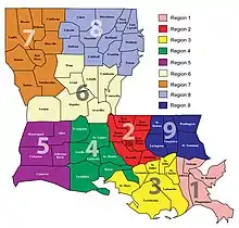 The Louisiana Department of Health provides public health services and oversight across Louisiana in nine regions.[8]