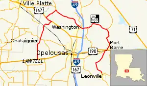 Louisiana Highway 103 (LA 103) is a state highway in St. Landry Parish, Louisiana, United States, that spans 39.5 miles (63.6 km) in a wide semi-circle around the north side of Opelousas.[1] The route is not bannered but runs in an overall west–east direction from U.S. Highway 190 (US 190) near Lawtell to LA 31 in Leonville. Along the way, it passes through the towns of Washington and Port Barre.