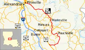 Louisiana Highway 107 (LA 107) is a state highway located in central Louisiana that runs 65.0 miles (104.6 km) in a north–south direction from U.S. Highway 71 (US 71) in Morrow to a junction with LA 1250 in Pineville at the Pineville Expressway (US 167/LA 28).[1] Along the way, LA 107 services Cottonport, Mansura, and Marksville, intersecting routes such as LA 29, LA 114, and LA 1. LA 107 has significant concurrencies with both LA 1 and LA 115 in the vicinity of Marksville.